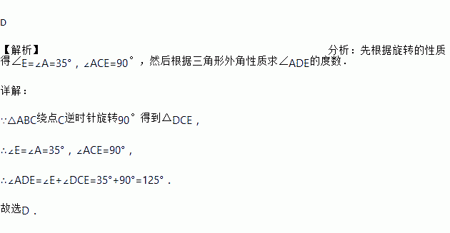 如图,把△ABC绕点C逆时针旋转90°得到△DCE,若∠A=35°,则∠ADE为( )