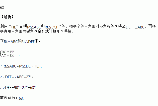 如图所示,有两个长度相等的滑梯(即BC=EF),左边滑梯的高度AC与右边滑梯的水平方向的长度DF相等,已知左边滑梯与地面的夹角∠ABC=27°,则右边滑梯与地面的夹角∠DFE=________°.