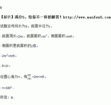 若一个圆锥的侧面积是底面积的2倍,则圆锥侧面展开图的扇形的圆心角为 ( )