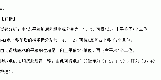 在平面直角坐标系中,已知线段AB的两个端点分别是A(-4,-1),B(1,1),将线段AB平移后得到线段A′B′,若点A′的坐标为(-2,2),则点B′的坐标为 ( )