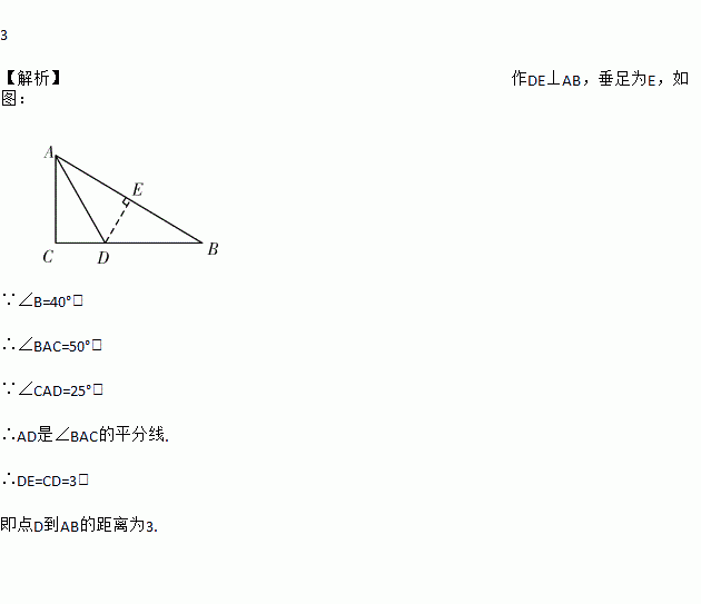 如图,△ABC中,∠C=90°,点D是BC上一点,连结AD.若CD=3, ∠B=40°,∠CAD=25°,则点D到AB的距离为______