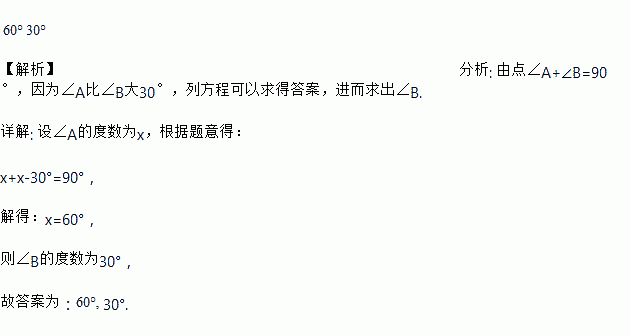 已知∠A与∠B互余,∠A比∠B大30°,则∠A=______,∠B=_______.