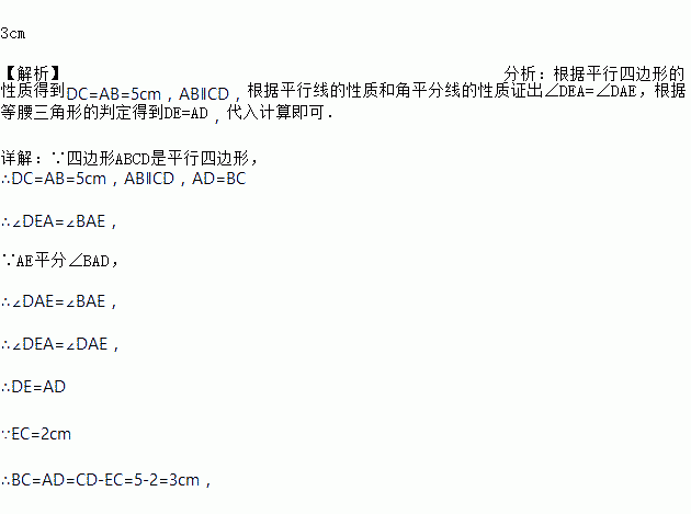 如图,在平行四边形ABCD中,∠BAD的平分线AE交边CD于E,AB=5cm,EC=2cm,则BC=_________.