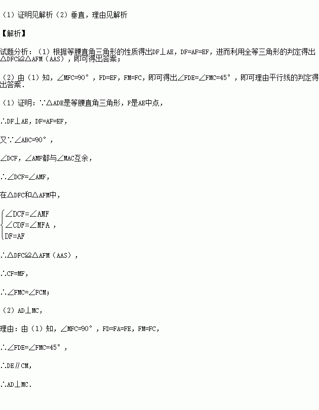如图,∠ABC=90°,D、E分别在BC、AC上,AD⊥DE,且AD=DE,点F是AE的中点,FD与AB相交于点M.