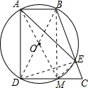 分析:连接BD,BM,AM,EM,DE,由90度角所对的弦为直径,得到BD为圆的直径,再利用直径所对的圆周角为直角,得到∠BMD为直角,利用三个角为直角的四边形为矩形得到ABMD为矩形,利用矩形的对边相等得到AB=DM,而DC=2AB,等量代换得到CD=2DM,可得出M为DC的中点,即DM=CM,故选项①正确;由AB与MC平行且相等,利用一组对边平行且相等的四边形为平行四边形,得到四边形AMCB为平行四边形,可得出AM=BC,而BD=AM,等量代换得到BC=BD,由BD为圆的直径,利用直径所对的圆周角为直角得到三角形DEC为直角三角形,由DC与EC的长,利用勾股定理求出DE的长,设BE=x,则BD=BC=BE+EC=x+2,在直角三角形BDE中,利用勾股定理列出关于x的方程,求出方程的解得到x的值,确定出BC的长,即为BD的长,确定出圆的直径,即可对于选项③作出判断;在直角三角形DEC中,由M为CD的中点,利用斜边上的中线等于斜边的一半得到DM与EM相等,都等于DC的一半,利用等弦所对的劣弧相等,得到弧DM=弧EM,同时由AB=DM,得到弧AB=弧DM,等量代换得到弧AB=弧EM,故选项②正确;在直角三角形AEM中,由AM与ME的长,利用勾股定理求出AE的长,即可对于选项④作出判断.