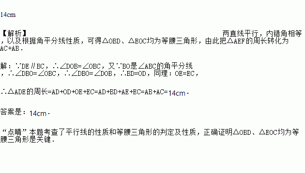 已知:如图,△ABC中,BO,CO分别是∠ABC和∠ACB的平分线,过O点的直线分别交AB、AC于点D、E,且DE∥BC.若AB=6cm,AC=8cm,则△ADE的周长为__.