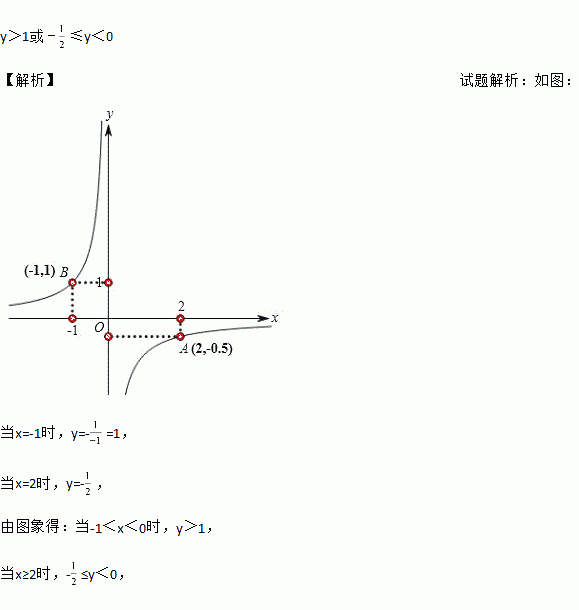已知函数y=﹣,当自变量的取值为﹣1<x<0或x≥2,函数值y的取值_____.