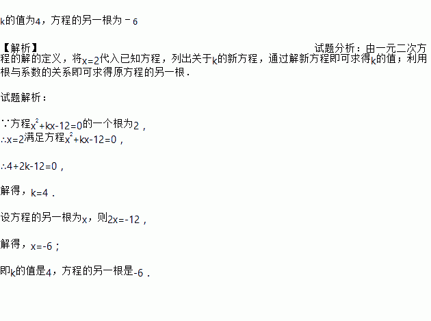 已知方程x2+kx﹣12=0的一个根为2,求k的值及方程的另外一个根?