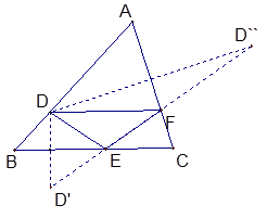 (2)作点D关于BC、AC的对称点D`、D``连结D`D``交BC、AC于E、F,则△DEF为所求![]()