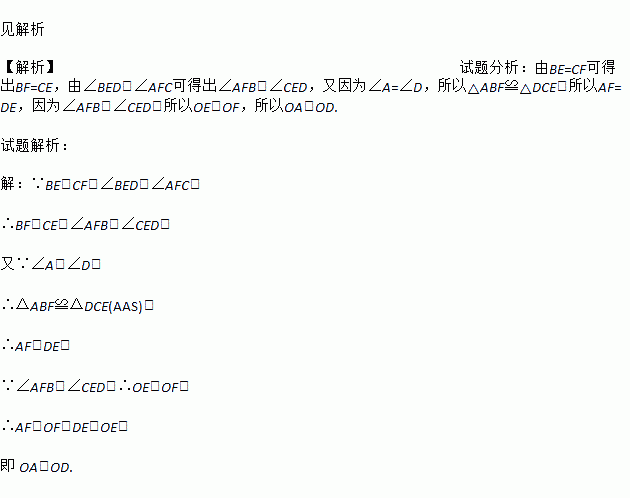 已知:如图,点 E,F 在 BC 上,BE=CF,∠A=∠D,∠BED=∠AFC,AF 与 DE交于点 O.