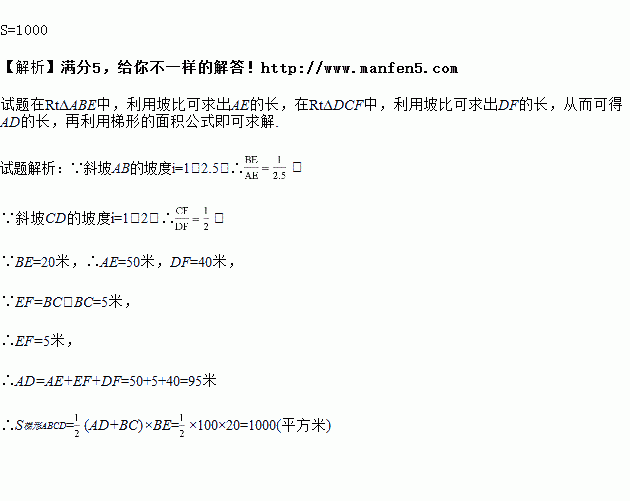 如图,水库大坝的横截面是梯形,坝顶宽5米,坝高20米,斜坡AB的坡比为1:2.5,斜坡CD的坡比为1:2,求大坝的截面面积