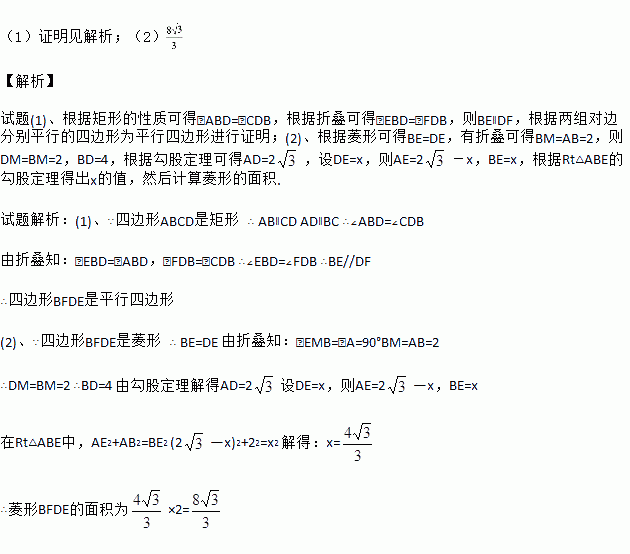 (2)若四边形BFDE是菱形,AB=2,求菱形BFDE的面积.