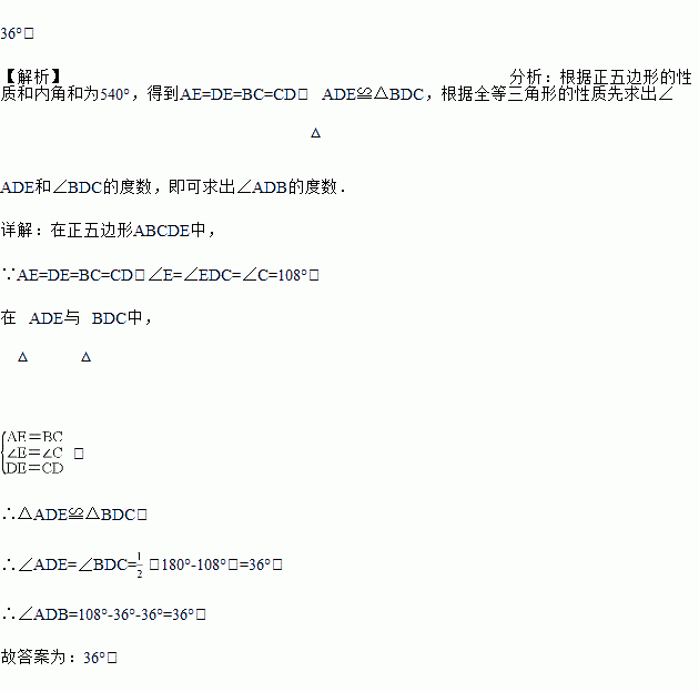 如图所示的正五边形ABCDE,连结BD、AD,则∠ADB的大小为_____.