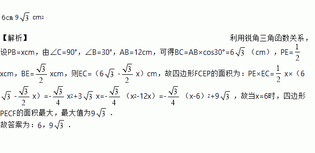 如图,在Rt△ABC中,∠C=90°,∠B=30°,AB=12cm,点P是AB边上的一个动点,过点P作PE⊥BC,PF⊥AC.当PB=_________时,四边形PECF的面积最大,最大值为_______.