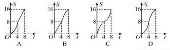 如图,在平面直角坐标系中,四边形OBCD是边长为4的正方形,平行于对角线BD的直线l从O出发,沿x轴正方向以每秒1个单位长度的速度运动,运动到直线l与正方形没有交点为止.设直线l扫过正方形OBCD的面积为S,直线l运动的时间为t(秒),下列能反映S与t之间函数关系的图象是( )