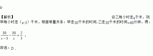 甲、乙两人同时从A地出发,骑自行车行30千米到B地,甲比乙每小时少走3千米,结果乙先到40分钟。若设乙每小时走x千米,则可列方程( )