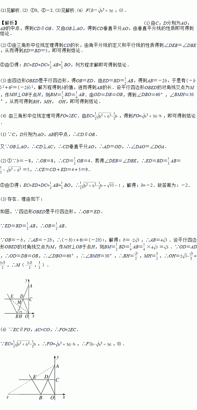 Èçͼ£¬ÔÚÆ½ÃæÖ±½Ç×ø±êϵÖУ¬ÒÑÖªµãA(0£¬6)£¬B(b£¬0)£¬ÇÒb£¼0£¬µãC£¬D·Ö±ðÊÇOA£¬ABµÄÖе㣬¡÷AOBµÄÍâ½Çƽ·ÖÏßÓëCDµÄÑÓ³¤Ïß½»ÓÚµãE.
