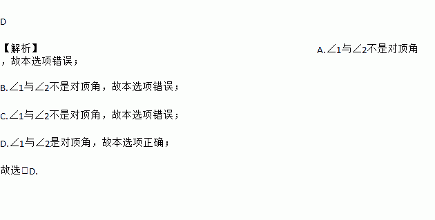D 【解析】A.∠1与∠2不是对顶角,故本选项错误; B.∠1与∠2不是对顶角,故本选项错误; C.∠1与∠2不是对顶角,故本选项错误; D.∠1与∠2是对顶角,故本选项正确; 故选:D.