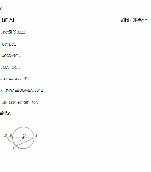 如图,AB是⊙O的直径,点D在AB的延长线上,DC切⊙O于点C,若∠A=25°,则∠D等于 ( )
