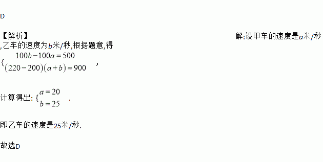 D 【解析】解:设甲车的速度是a米/秒,乙车的速度为b米/秒,根据题意,得 , 计算得出: . 即乙车的速度是25米/秒. 故选D