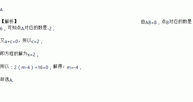 如图,数轴上A、B、C三点所表示的数分别是a,6,c,已知AB=8,a+c=0,且c是关于x的方程(m-4)x+16=0的一个解,则m的值为( )