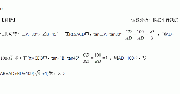 如图,从热气球C处测得地面A、B两点的俯角分别是30°、45°.如果此时热气球C处的高度CD为100米,点A、D、B在同一直线上,则AB两点的距离是( )