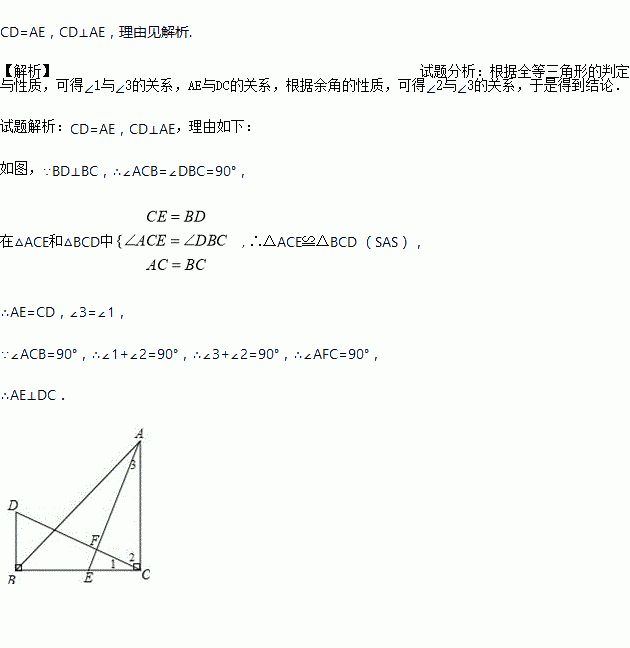 如图,△ABC中,∠ACB=90°,AC=BC,BD⊥BC于B,点E在 BC上,CE=BD,DC、AE交于点F.试问DC与AE有何数量与位置关系?请说明理由.