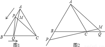 如图1,点P、Q分别是等边△ABC边AB、BC上的动点(端点除外),点P从顶点A、点Q从顶点B同时出发,且它们的运动速度相同,连接AQ、CP交于点M.