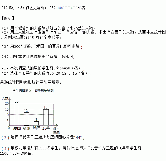 某校九年级开展征文活动,征文主题只能从“爱国”“敬业”“诚信”“友善”四个主题选择一个,九年级每名学生按要求都上交了一份征文,学校为了解选择各种征文主题的学生人数,随机抽取了部分征文进行了调查,根据调查结果绘制成如下两幅不完整的统计图.