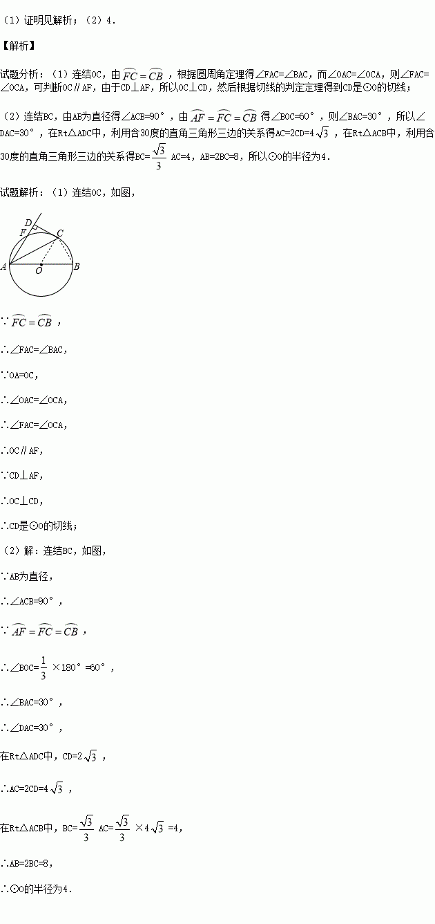 如图,AB是⊙O的直径,点F,C是⊙O上两点,且,连接AC,AF,过点C作CD⊥AF交AF延长线于点D,垂足为D.