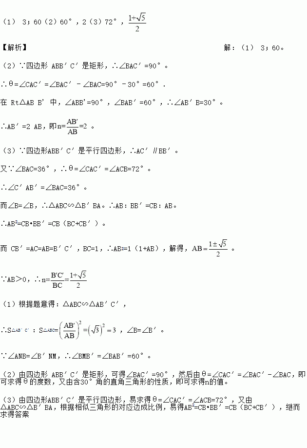 (3)如图③,△ABC中,AB=AC,∠BAC=36°,BC=l,对△ABC作变换[θ,n]得△AB′C′,使点B、C、B′在同一直线上,且四边形ABB'C'为平行四边形,求θ和n的值.