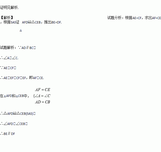 如图,已知点A,E,F,C在同一直线上,AE=FC,过点A,C 作AD∥BC,且AD=CB.