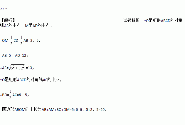 如图,O是矩形ABCD的对角线AC的中点,M是AD的中点若AB=5,AD=12,则四边形ABOM的周长为__________。
