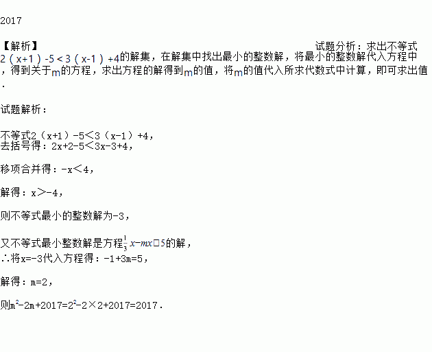 若不等式2(x+1)-5<3(x-1)+4的最小整数解是关于x的方程x-mx=5的解,求式子m2-2m+2017的值.