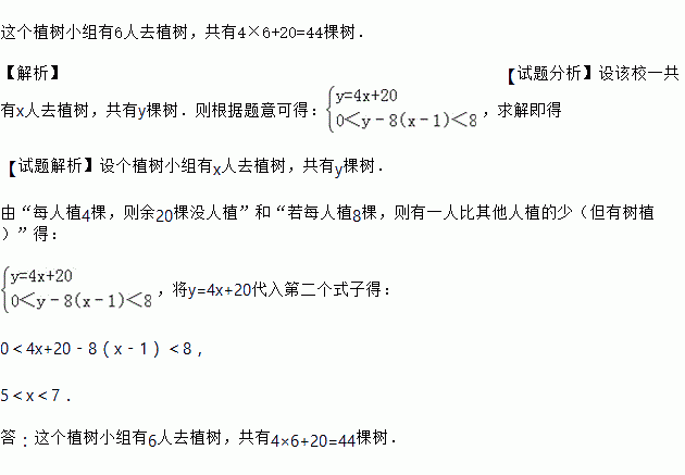 每年3月12日是植树节,某学校植树小组若干人植树,植树若干棵.若每人植4棵,则余20棵没人植,若每人植8棵,则有一人比其他人植的少(但有树植),问这个植树小组有多少人?共有多少棵树?