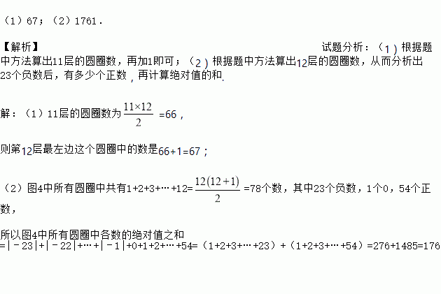 (1)67;(2)1761. 【解析】试题分析:(1)根据题中方法算出11层的圆圈数,再加1即可;(2)根据题中方法算出12层的圆圈数,从而分析出23个负数后,有多少个正数,再计算绝对值的和. 【解析】 (1)11层的圆圈数为=66, 则第12层最左边这个圆圈中的数是66+1=67; (2)图4中所有圆圈中共有1+2+3+…+12==78个数,其中23个负数,1个0,54...