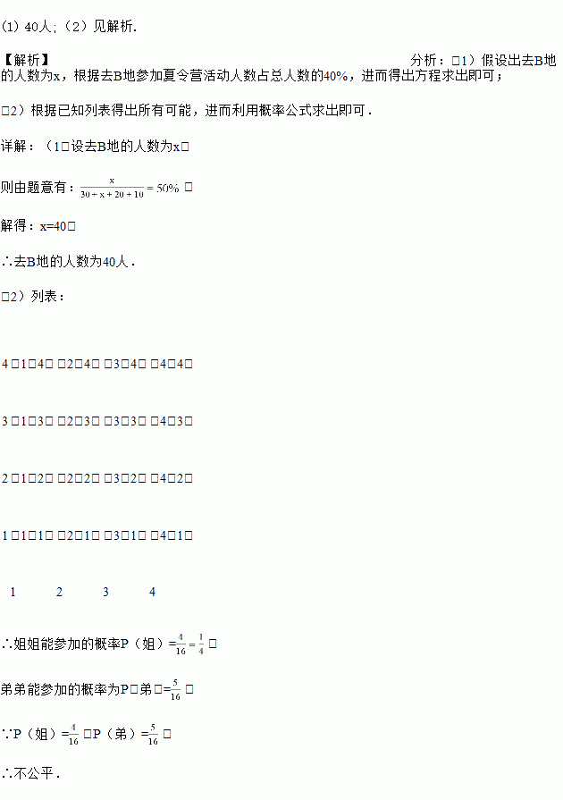 (1)去B地参加夏令营活动人数占总人数的40%,根据统计图求去B地的人数?