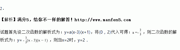 如图,二次函数y=ax2+bx+c的图象经过点(﹣1,0)、(3,0)和(0,2),当x=2时,y的值为________ .