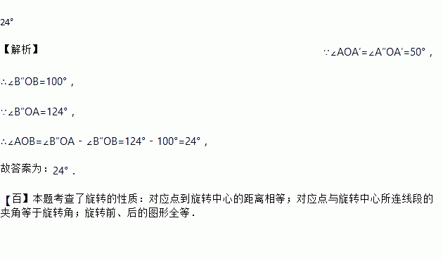 如图,将△OAB绕点O逆时针连续旋转两次得到△OA″B″,每次旋转的角度都是50°,若∠B″OA=124°,则∠AOB=_____.