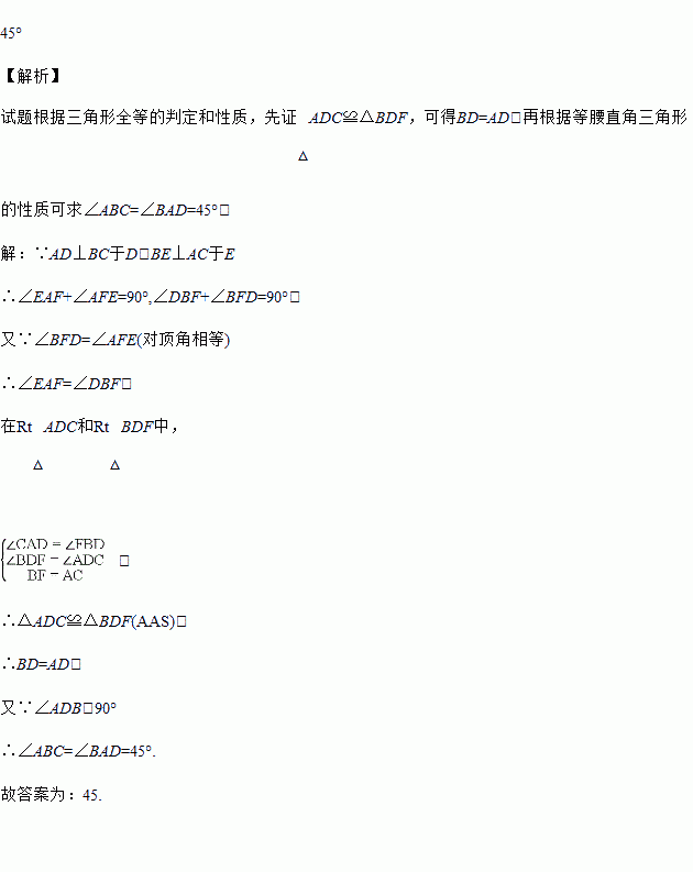 如图,在△ABC中,AD⊥BC于D,BE⊥AC于E,AD与BE相交于点F,若BF=AC,则∠ABC=_______