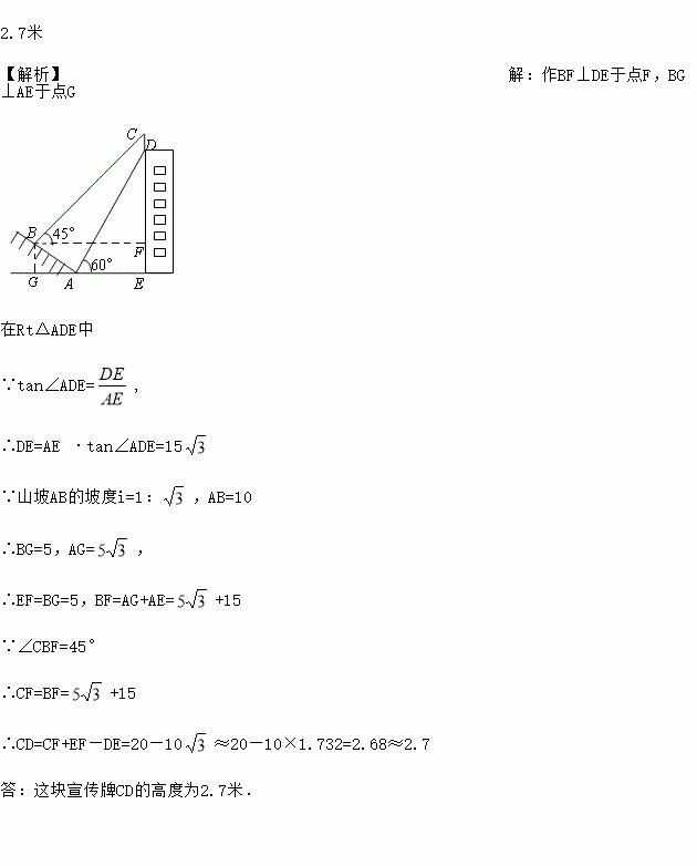 如图,某校一幢教学大楼的顶部竖有一块“传承文明,启智求真”的宣传牌CD.小明在山坡的坡脚A处测得宣传牌底部D的仰角为60°,沿山坡向上走到B处测得宣传牌顶部C的仰角为45°.已知山坡AB的坡度i=1:,AB=10米,AE=15米,求这块宣传牌CD的高度.(测角器的高度忽略不计,结果精确到0.1米.参考数据:≈1.414,≈1.732)