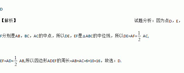 如图,在△ABC中,AB=6,AC=10,点D,E,F分别是AB,BC,AC的中点,则四边形ADEF的周长为( )