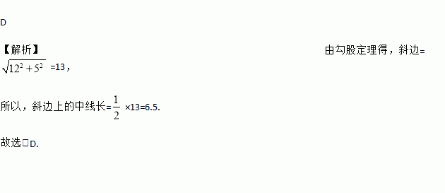 D 【解析】由勾股定理得,斜边==13, 所以,斜边上的中线长=×13=6.5. 故选:D.
