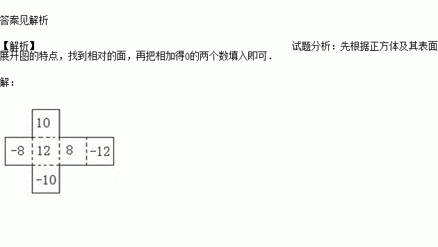 如图是一个正方体盒子的展开图,要把-8、10、-12、8、-10、12些数字分别填入六个小正方形,使得按虚线折成的正方体相对面上的两个数相加得0.