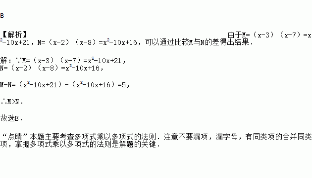 B 【解析】由于M=(x-3)(x-7)=x2-10x+21,N=(x-2)(x-8)=x2-10x+16,可以通过比较M与N的差得出结果. 【解析】 ∵M=(x-3)(x-7)=x2-10x+21, N=(x-2)(x-8)=x2-10x+16, M-N=(x2-10x+21)-(x2-10x+16)=5, ∴M>N. 故选B. “点睛”本题主要考查多项式乘以多项式的...