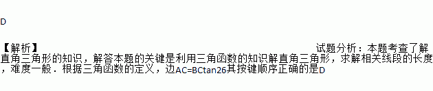 如图,在△ABC中,∠ACB=90°,∠ABC=26°,BC=5.若用科学计算器求边AC的长,则下列按键顺序正确的是( )