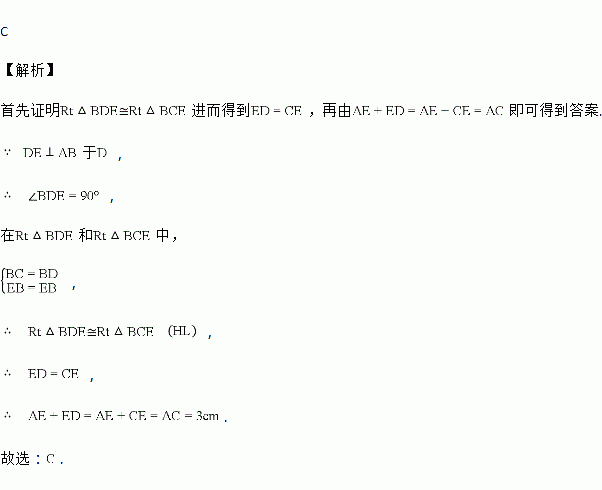 如图,在△ABC中,∠C=90°,DE⊥AB于点D,BC=BD.如果AC=3cm,那么AE+DE= ( )