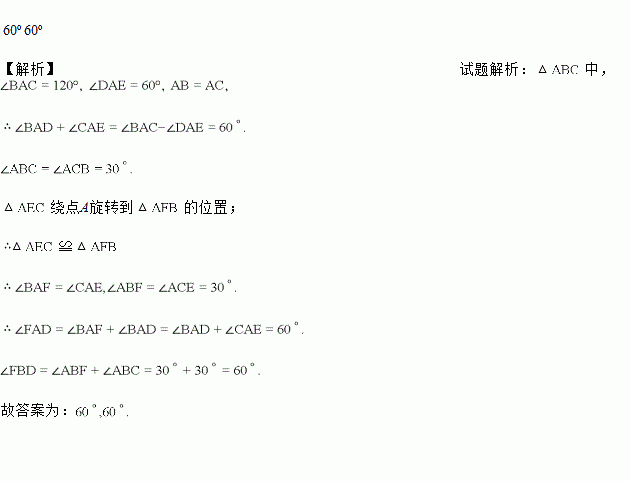 如图所示,△ABC中,∠BAC=120°,∠DAE=60°,AB=AC,△AEC绕点A旋转到△AFB的位置;∠FAD=__________,∠FBD=____________.
