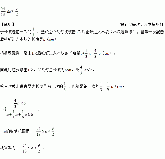 ,已知这个铁钉被敲击3次后全部进入木块(木块足够厚),且第一次敲击后,铁钉进入木块的长度是a(cm),若铁钉总长度为6(cm),则a的取值范围是__.