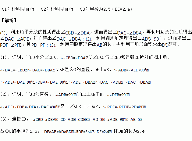 已知:如图,△ABC内接于⊙O,AB为直径,∠CBA的平分线交AC于点F,交⊙O于点D,DE⊥AB于点E,且交AC于点P,连结AD.